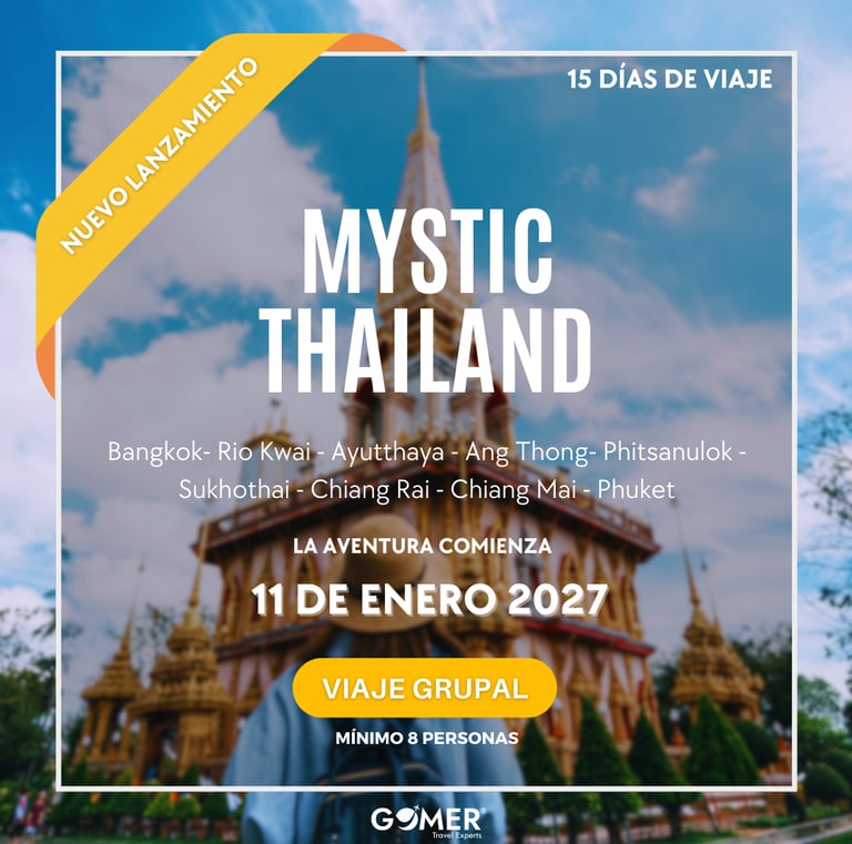 Adéntrate en Tailandia en un viaje lleno de espiritualidad, cultura y paisajes fascinantes. Recorre Bangkok, el Río Kwai, Ayutthaya, Ang Thong, Phitsanulok, Sukhothai, Chiang Rai, Chiang Mai y Phuket mientras descubres templos milenarios, selvas exuberantes y playas de ensueño. Conecta con la historia en las antiguas capitales de Ayutthaya y Sukhothai, maravíllate con los templos únicos del norte como el Templo Blanco en Chiang Rai, y vive una experiencia inolvidable al interactuar de forma responsable en un santuario de elefantes. Finaliza con la serenidad y belleza tropical de Phuket. Todo dentro de un itinerario cuidadosamente diseñado, con experiencias auténticas y cultura local.